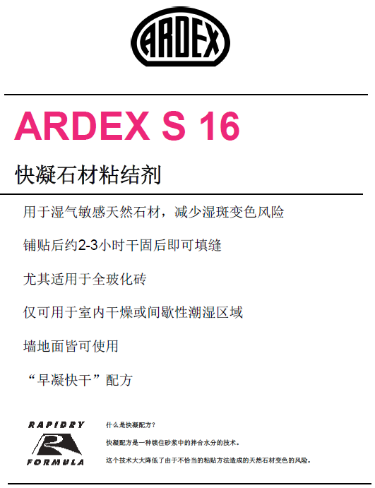 使用ARDEX S 16 粘貼瓷磚和馬賽克在常 溫下2小時后即可填縫作業(yè)和上人。尤其適 用于粘結(jié)床需要快干或粘貼后短時內(nèi)需要 填縫投入使用的情況。